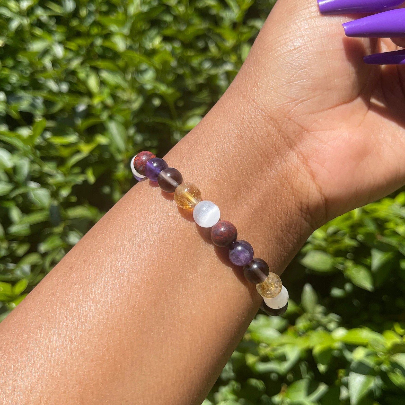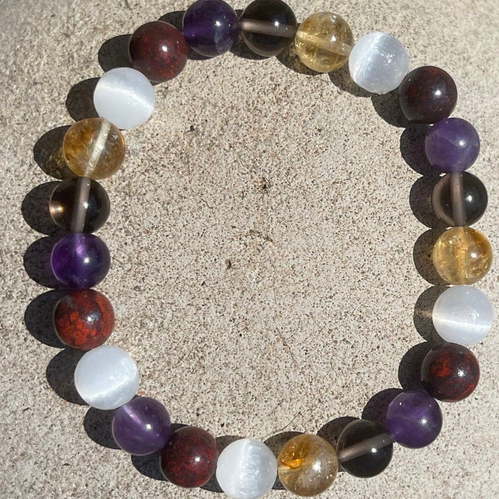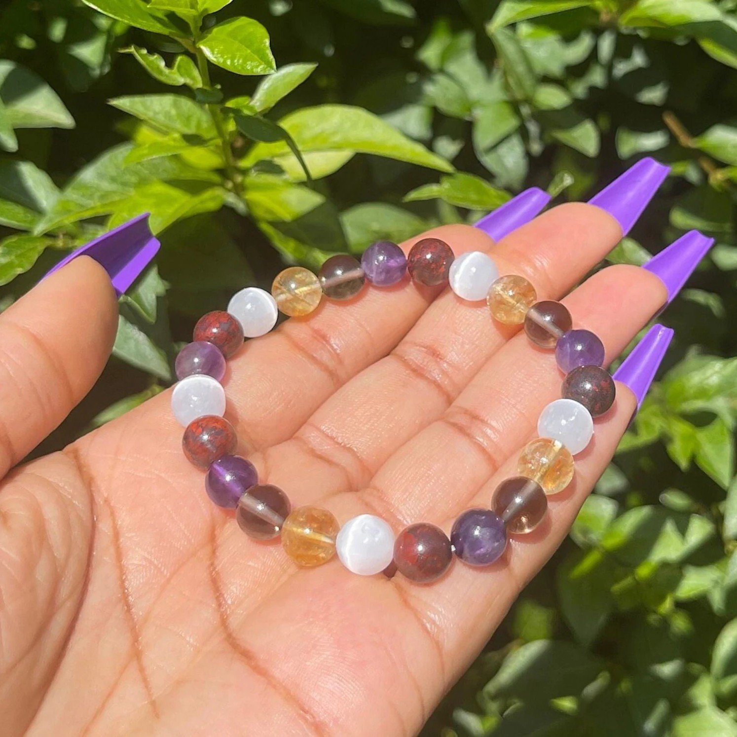 The Pain Recovery Bracelet Combination features Selenite, Citrine, Smoky Quartz, Amethyst, and Red Jasper, known for their soothing and restorative energies. This healing blend supports relaxation, eases discomfort, and encourages faster recovery with balanced mind-body energy.