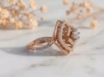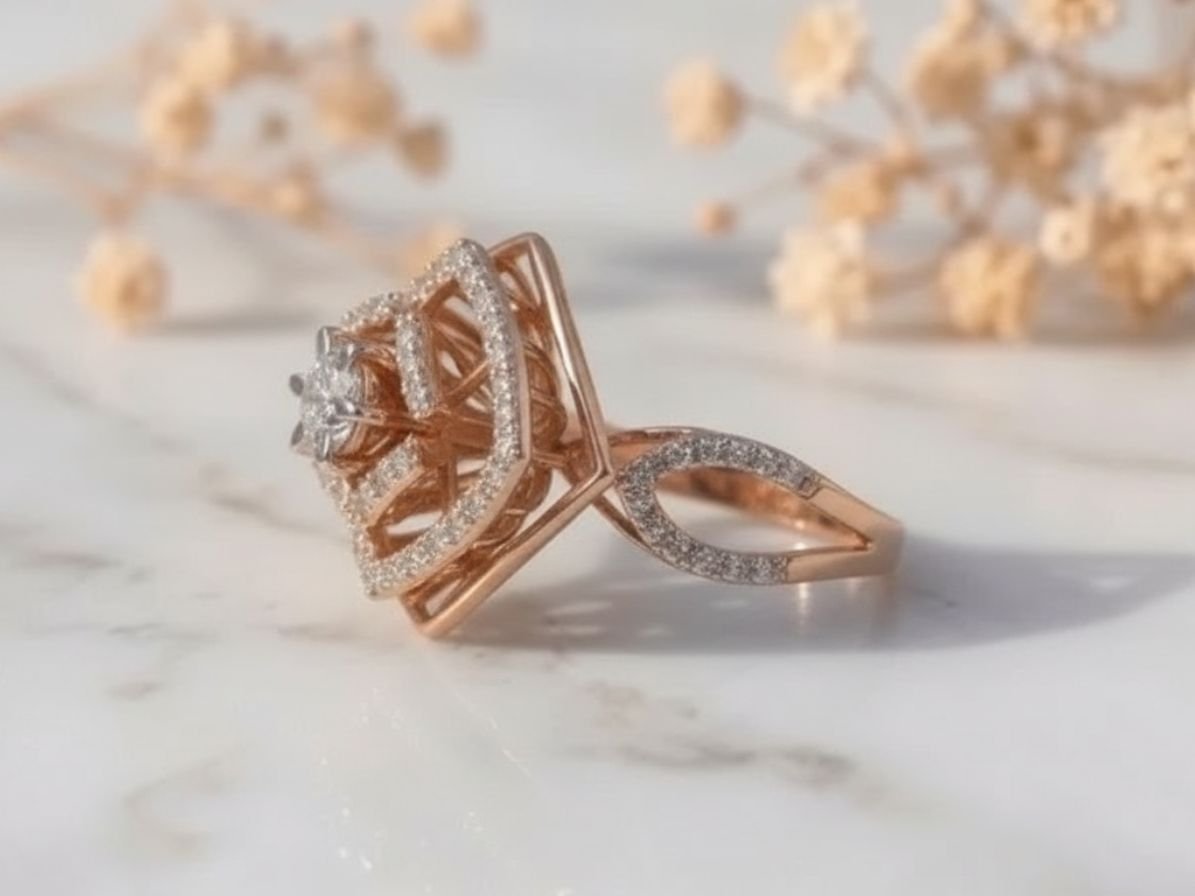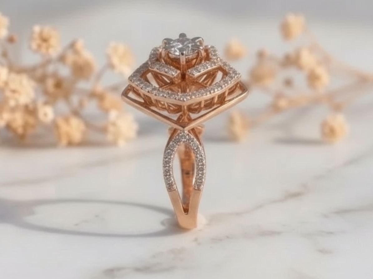 The floral-inspired setting enhances the brilliance of the centre diamond, while the split shank band adds dimension and contemporary style. Fine detailing along the band and setting gives the ring a luxurious and designer finish, making it perfect for those who appreciate unique craftsmanship.