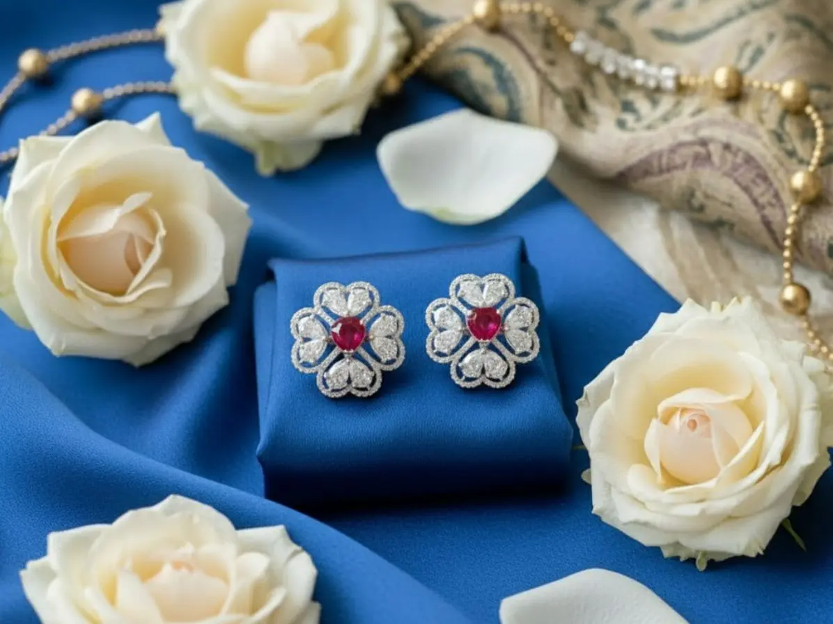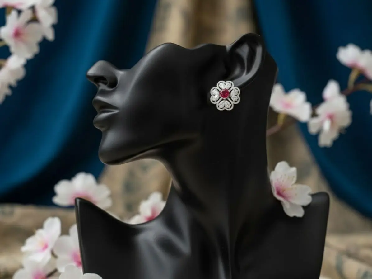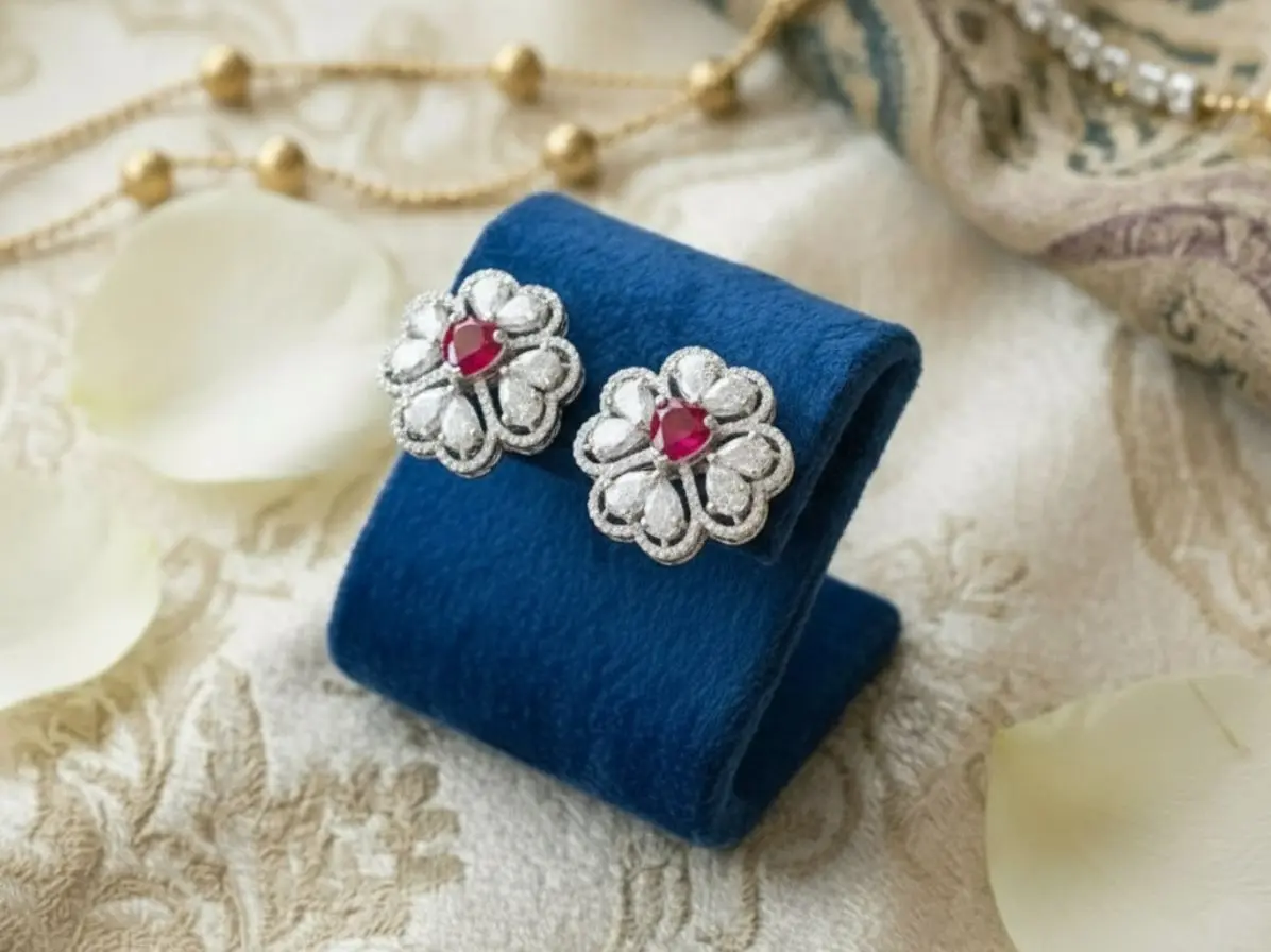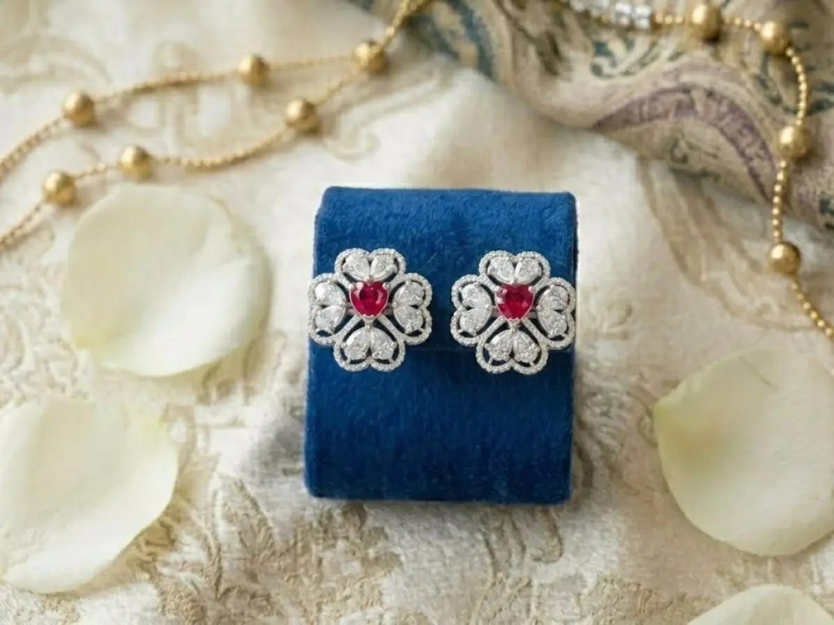 The Heart-Centered Ruby Floral Halo Diamond Studs represent passion, beauty, and timeless elegance. Their unique design and radiant sparkle make them a cherished addition to any jewellery collection.