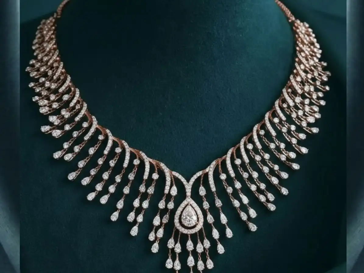 This necklace set beautifully combines fluid design with radiant sparkle. The waterfall pattern enhances visual elegance and creates a sense of movement, while the diamonds add brilliance—making it a perfect centerpiece for any jewellery collection.