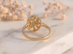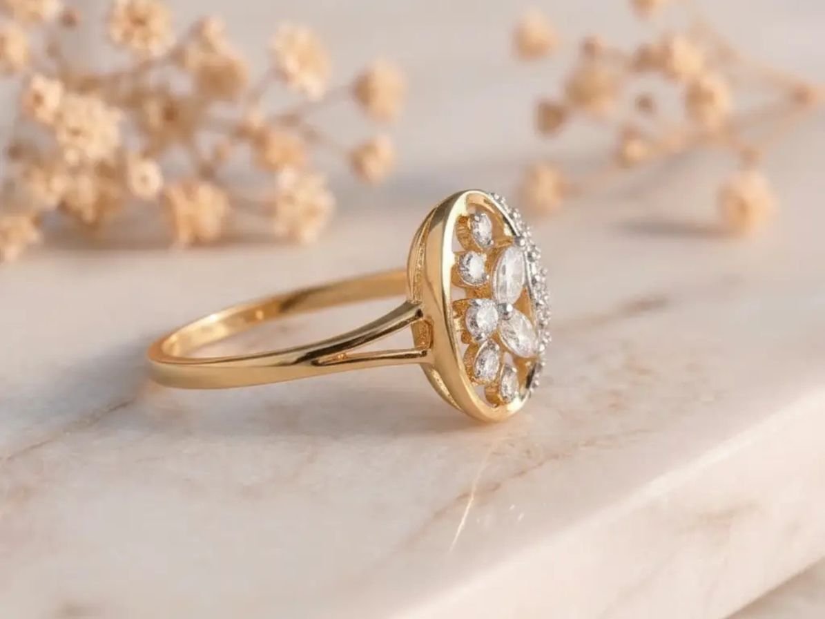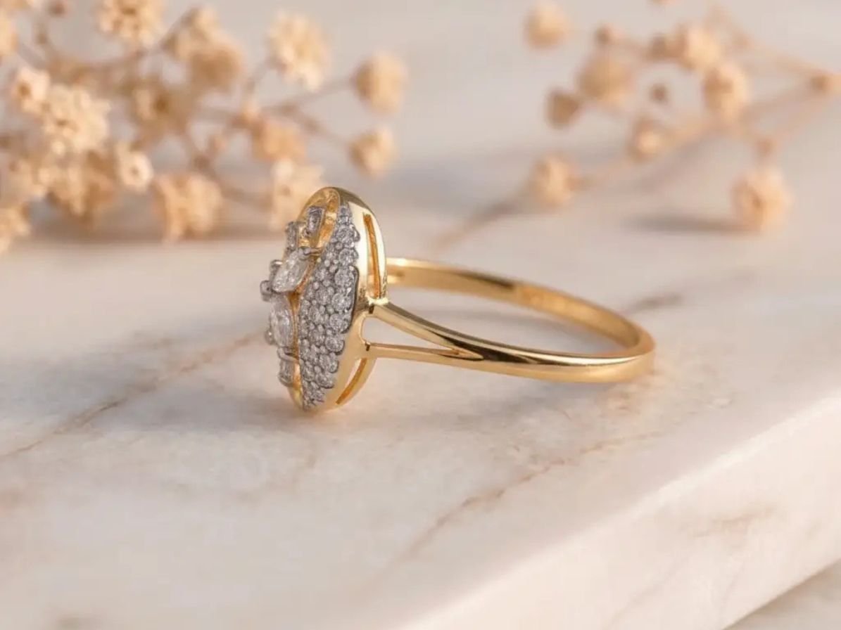 The floral cluster detailing adds texture and brilliance, while the oval frame enhances the ring’s refined silhouette. Set in a sleek gold band, the design offers a graceful contrast between structure and sparkle, making it a standout piece for everyday elegance or special occasions.