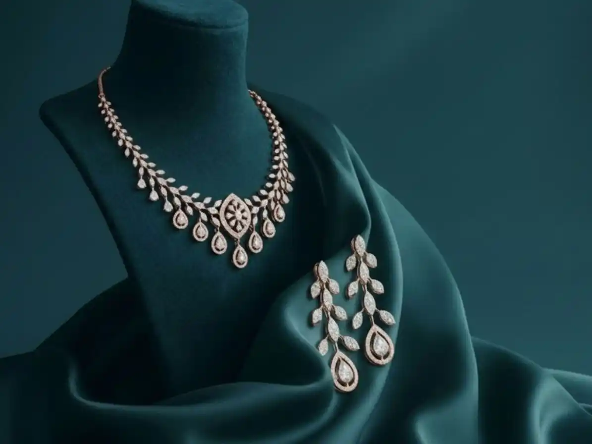 This necklace set beautifully blends flowing design with radiant sparkle. The cascade pattern enhances brilliance and movement, while the teardrop elements add elegance and charm—making it a perfect centerpiece for any jewellery collection.
