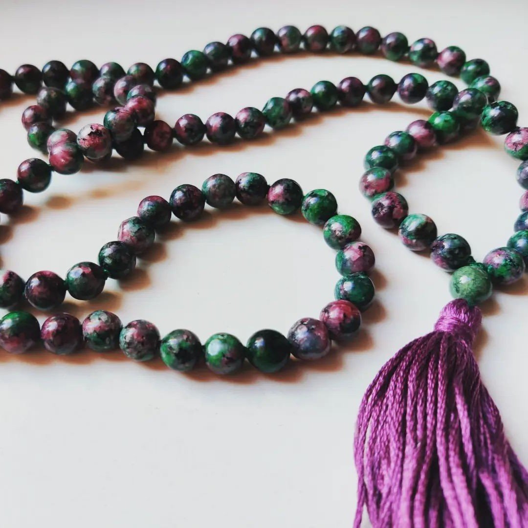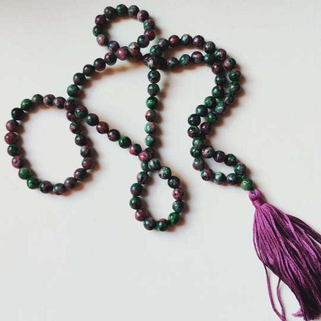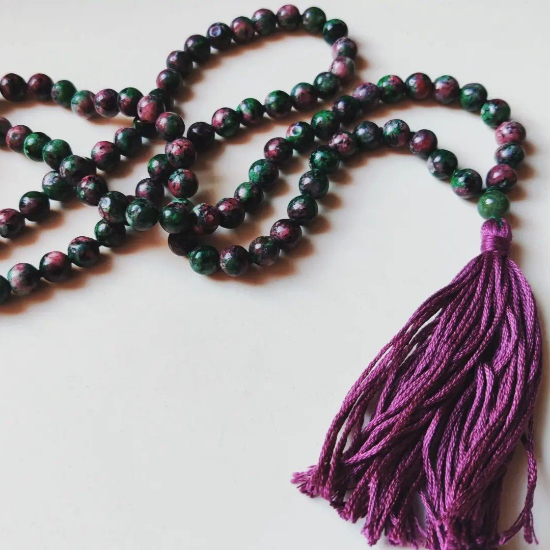 A ruby zoisite Mala, also known as Anyolite. It stimulates the heart chakra, promoting feelings of love, compassion, and forgiveness, boost the immune system, and promote overall well-being.