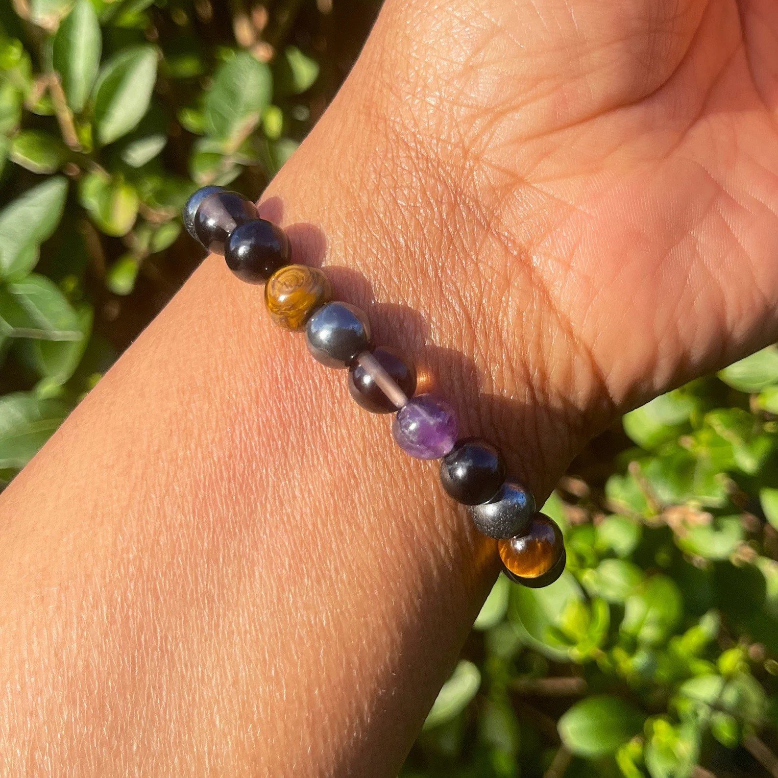 The Triple Protection Bracelet Combination includes Black Tourmaline, Amethyst, Smoky Quartz, Tiger Eye, and Hematite, creating a strong shield against negativity and unwanted energies. This grounding blend enhances courage, emotional balance, and inner strength while keeping you protected throughout the day.